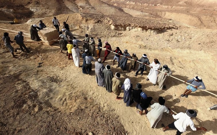 Sempre durante la campagna del 2019 si è condotto un esperimento al fine di comprendere come venisse manipolato e trasportato un blocco calcareo di quel tipo. Per poter esaminare e valutare i mezzi necessari si è deciso di spostare un blocco, estratto nel 2018, dalla cava al sito, vale a dire per una distanza di circa 400 metri su un dislivello negativo di 40 metri. Il blocco, poco più di un metro cubo, aveva un peso di circa 2,5 tonnellate ed il trasporto è stato effettuato in tre giorni. Per iniziare, si è supposto che il blocco potesse essere semplicemente trascinato sul suolo, preparato in modo da rimuovere le maggiori asperità, con l’aiuto di assi e spargendo sabbia. Per evitare che gli spigoli affondassero nel terreno sono stati leggermente arrotondati. Il primo tentativo, fallito, è stato effettuato impiegando quattro persone e una grande corda di canapa. Si è aumentato mano a mano il numero di braccia, sino a raggiungere l’impiego di 32 operai. In queste condizioni si è riusciti a spostare il blocco solo di qualche metro, finché ci si è resi conto che per migliorare la performance la posizione della corda assumeva un rilievo decisamente importante. Appariva chiaro che se era posizionata troppo in alto il blocco tendeva a sollevare la parte retrostante creando un forte attrito sugli assi di legno e non permettendo più l’avanzamento. Si è quindi optato per uno scorrimento legno contro legno inframmezzato da un velo di sabbia. In pratica il blocco è stato caricato su una specie di slitta di legno leggero sostenuta da due traverse. Con la corda ancora legata intorno al blocco è ripreso il test ed il sistema si è rivelato molto più efficiente: lo spostamento è avvenuto utilizzando solo 20 persone. L’utilizzo di leve di legno azionate sul retro del blocco si è rivelato indispensabile per fornire l’impulso iniziale alla partenza e mantenerlo in posizione corretta. Non essendo continua la trazione, ma a scatti successivi, lo sforzo di ogni individuo doveva essere perfettamente sincronizzato, per ottenere la massima efficienza (Immagine n. 5).
