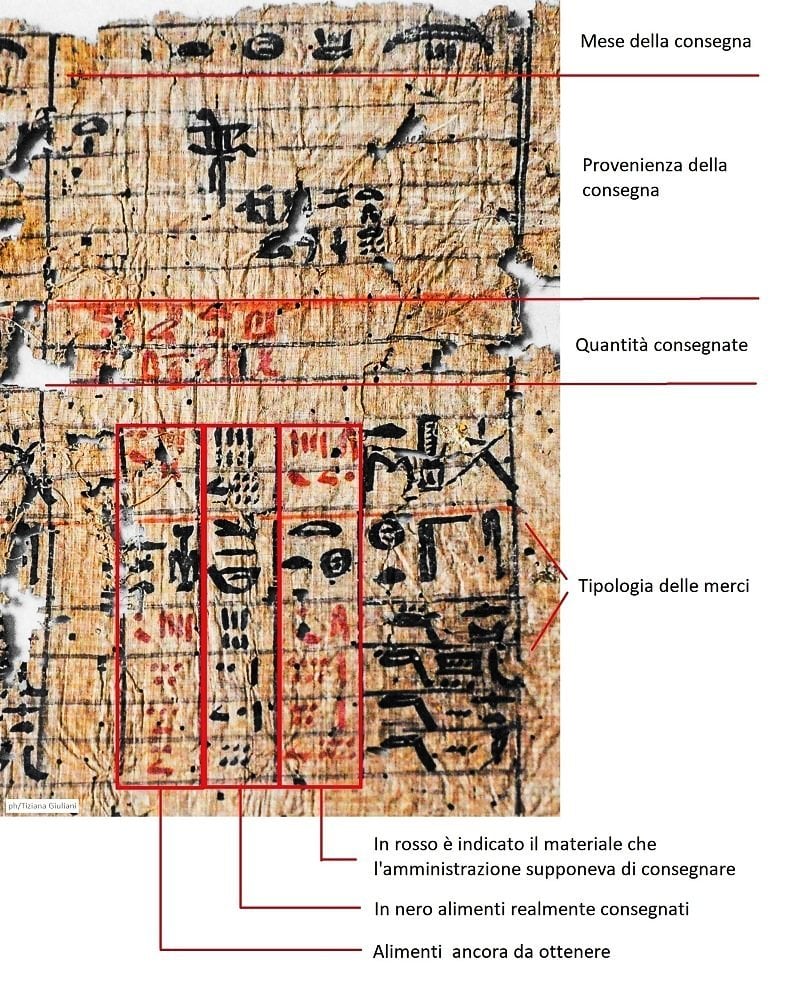 Questo tipo di documento, organizzato in tabelle, è già ben conosciuto attraverso lotti di papiri più tardi rinvenuti, in particolare, nei complessi funerari dei re Neferirkara e Raneferef ad Abusir. Per ogni tipo di prodotto che deve essere consegnato all’equipe, sono state previste tre caselle: una per indicare la quantità della dotazione prevista, quella al centro indica ciò che è stato effettivamente consegnato, l’ultima ciò che è ancora in sospeso. Si osserva, inoltre, un particolare estremamente interessante sulla più completa di queste contabilità che registra il conferimento di differenti tipi di cereali: il titolo del documento, scritto sul retro, al fine di poterlo identificare una volta arrotolato il papiro, indica ḥsb n t: registro del pane (Immagine n. 3).