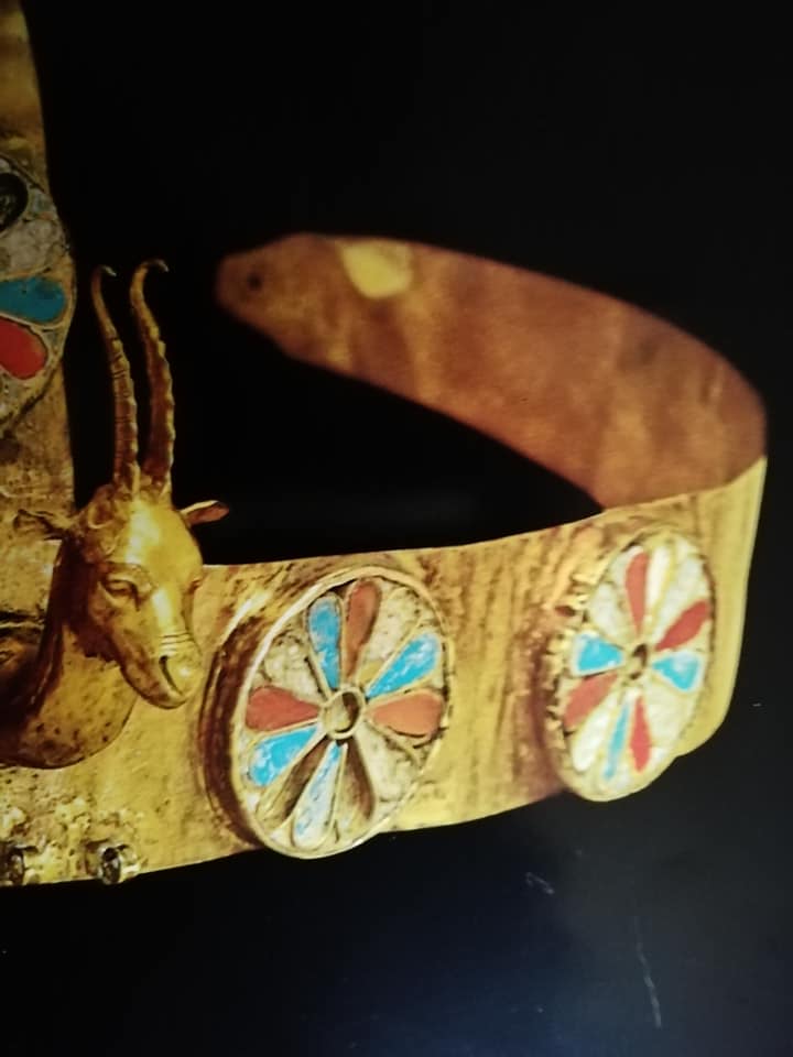 Il diadema, in oro con intarsi in pietre semipreziose, è ornato dalle due teste di gazzella, simbolicamente analoghe al doppio cobra o alle due piume.
