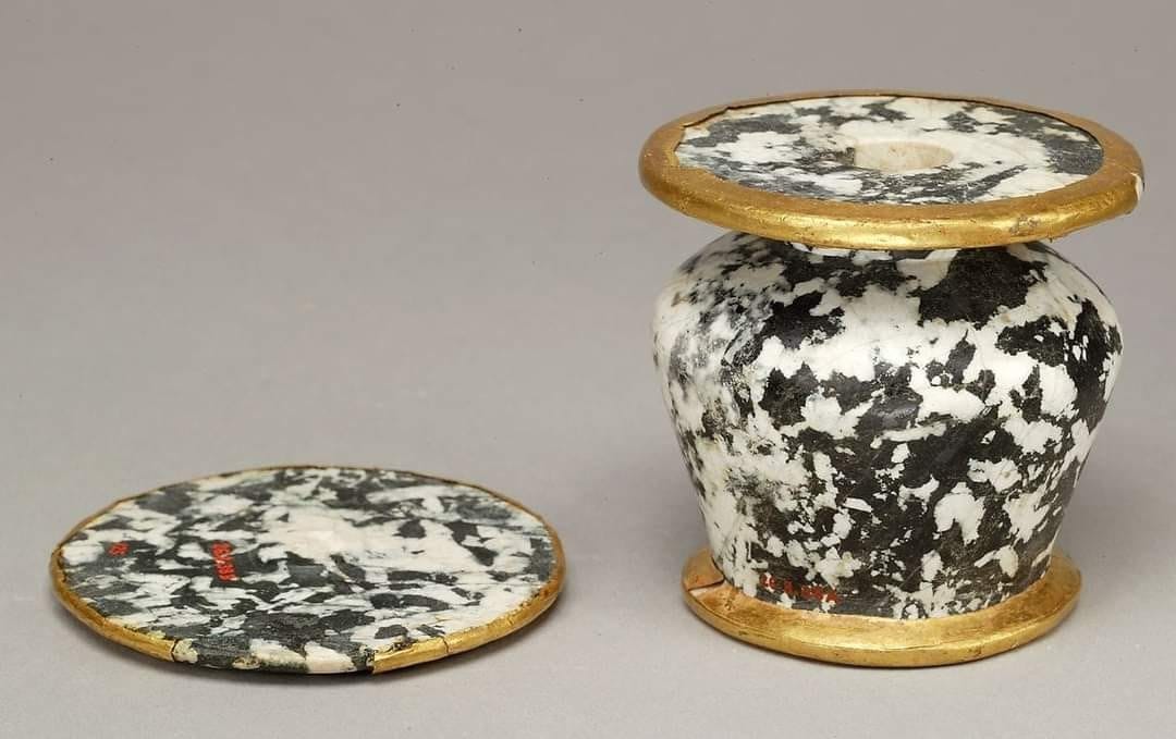 Questo vasetto , contenitore per kohl, è alto 10,5 cm, è realizzato in diorite e foglia d’oro.