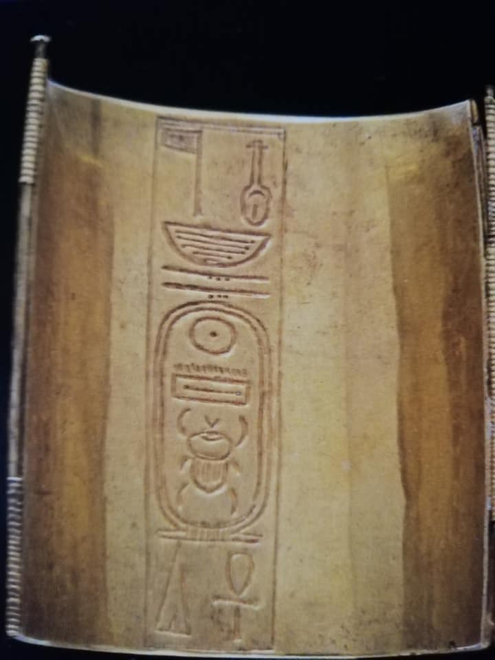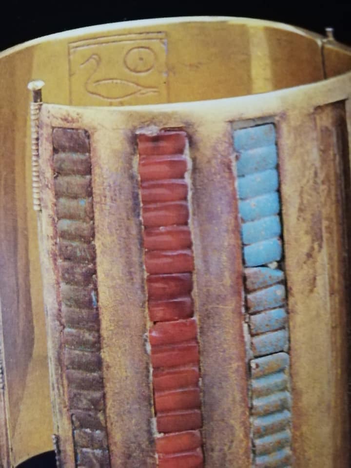 Questo massiccio ornamento in oro è di raffinata fattura, ed è intarsiato con corniola e vetro, al suo interno sono incisi i nomi di Thutmosi III.