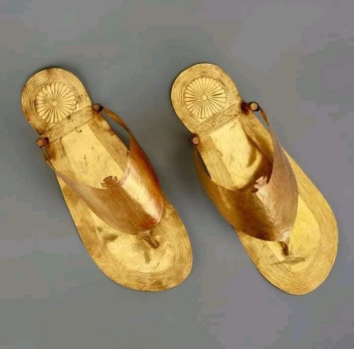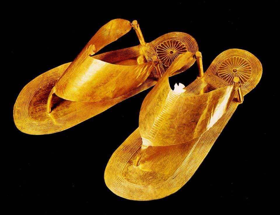 Tre magnifici paia di sandali, realizzati in foglia d’oro, esposti al Metropitan Museum of Art di New York con i riferimenti 26.8.147 a,b. – 26.8.147a,b – 26.8.148.a,b.