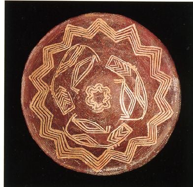 Gli ippopotami sono stilizzati e occupano lo spazio tra le linee ondulate concentriche della rosetta centrale che rappresentano l’acqua, e le linee a zigzag attorno al bordo che suggeriscono scogli. Il manufatto è realizzato con argilla rossastra di limo del Nilo, brunito, rivestito con un sottile strato rosso e quindi decorato con motivi lineari in vernice bianca.