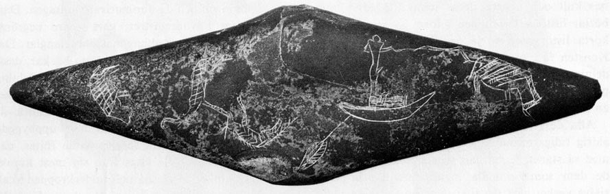 Questa immagine si è rilevata anche su di una paletta romboidale in ardesia risalente al 4000 – 3500 a. C. e conservata al Medelhavsmuséet di Stoccolma, su di un tessuto di lino trovato a Gebelein datato attorno al 3600 – 3350 a. C. ed ora esposto al Museo egizio di Torino e sulle pareti rocciose che costeggiano il Nilo e gli uadi dei deserti orientali e occidentali, 8000 anni fa abitati dai progenitori degli antichi egizi, migrati verso il Nilo a causa del progressivo inaridimento dell’area.