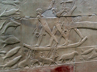 A Giza ed a Sakkara la scena tradizionale comprende il defunto di grandi dimensioni che si trova su di una piccola imbarcazione accanto ai suoi servi che cacciano per lui, esponendosi al pericolo.