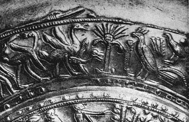 Un piccolo sigillo in diaspro del VII secolo aC proveniente da Tharros, nel golfo di Oristano, porta incise due figure di uomini in abbigliamento egiziano, con una pianta di loto e un gallo; il gallo fu il soggetto favorito dagli artisti in terrecotte sia Greci che Fenici operanti nella zona del Delta intorno al 500 aC.