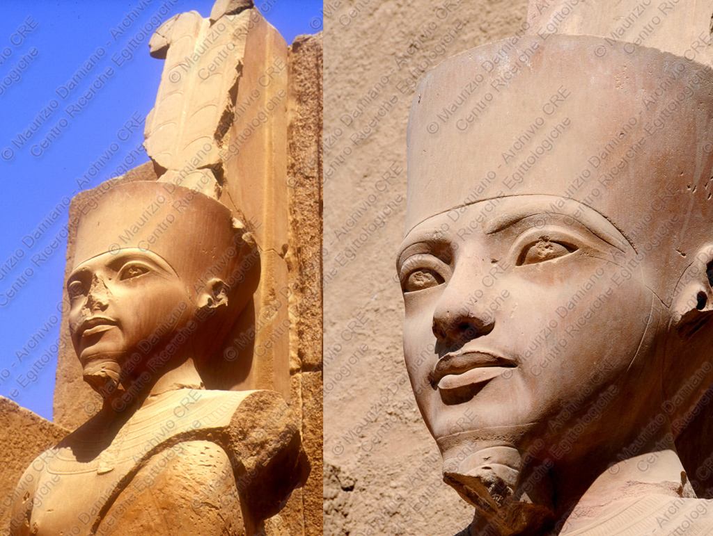Immagine 10. Il dio Amon con il volto di Tutankhamon; a sinistra, così come è stato visibile per decenni; a destra, il volto dopo il restauro seguito al ritrovamento del naso mancante. Altro grande simbolo del concetto del Divino universale, inafferrabile e inconcepibile per l’umanità, è Amon. Uno degli inni dedicatigli recita: “tu, che hai 99 nomi, ma il tuo vero nome è “Amon””. Ora, cosa vuol dire Amon? Vuol dire… “nascosto”. Noi non possiamo conoscere la realtà del divino, che resta a noi nascosto. Raffigurare la divinità con il volto del sovrano regnante ha sempre la funzione di perpetuare a doppio senso la creazione e ciò che vi è connesso: il faraone rafforzerà la propria natura divina, e il dio proteggerà il re e il paese (© Archivio CRE/Maurizio Damiano).