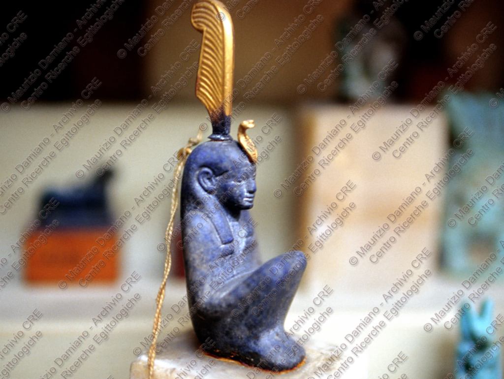 Immagine 11. Statuetta di Maat in lapislazzuli e oro; Museo Egizio del Cairo. Concetto fondamentale nel pensiero egizio, la Maat è l’equilibrio cosmico che bisogna mantenere tutti i giorni. Le sue rappresentazioni non hanno una vacua funzione “artistica”, ma sono deputate a mantenere l’ordine cosmico (© Archivio CRE/Maurizio Damiano).