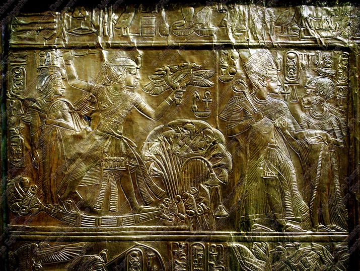 Immagine 3. Tutankhamon a caccia di uccelli nella palude (la sconfitta del male), accompagnato dalla moglie, che incarna la Dea. A destra, il faraone, pronto al cammino nell’aldilà, ancora debole sul percorso della rinascita, viene amorevolmente sostenuto e accompagnato dalla moglie, a un tempo vedova umana, regale, e Dea, verso l’ingresso dell’aldilà, per il percorso di rigenerazione; Museo del Cairo (© Archivio CRE/Maurizio Damiano).