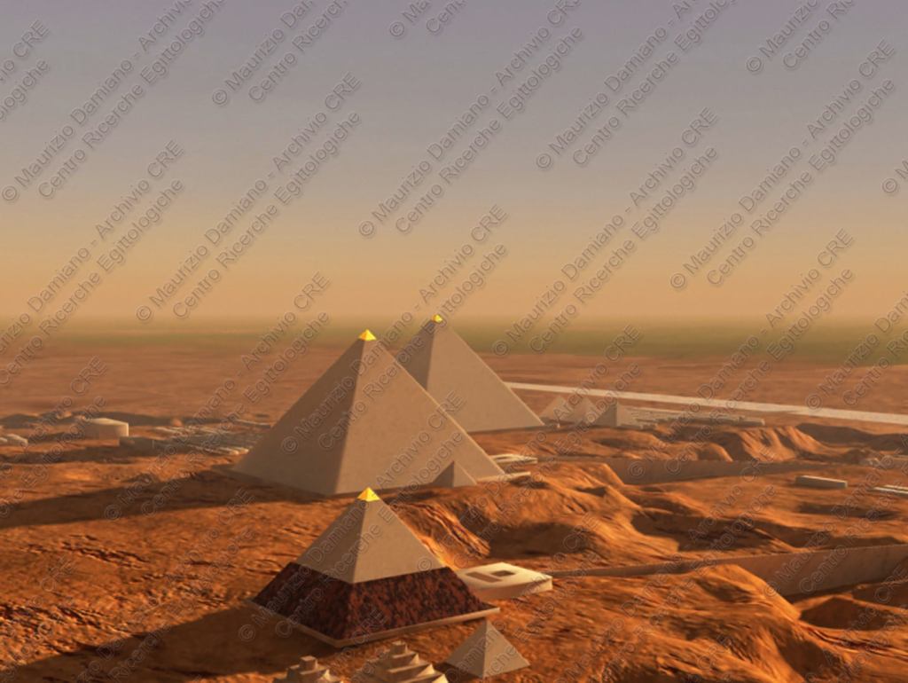 Immagine 4. Ricostruzione 3D della piana di Giza con le piramidi. Anche qui vale il concetto di creazione: le piramidi racchiudono un insieme di concetti che partono dalla preistoria e che, sviluppandosi nel tempo, si accumulano senza andar perduti: così troveremo l’antico tumulo delle tombe predinastiche (il tumulo primevo), la mastaba (il palazzo reale), la piramide a gradini (mastabe sovrapposte, scala per il cielo) e il tutto racchiuso nella forma della piramide perfetta (benben, tumulo primevo e raggio di sole pietrificato); tutti questi, e molti altri concetti, non sono solo teologia o architettura, ma sono vere parole divine e dunque creazione di una realtà per il mondo divino; ciò che rende le piramidi non semplici tombe, ma vere macchine di eternità che devono dare non solo la vita eterna al faraone, ma renderlo divino affinché – società etica egizia! – possa continuare a compie il suo dovere di hem, di servo divino; ossia aiutare il gregge di dio (l’umanità) a mantenere la Maat perché la Creazione si perpetui ogni giorno (© Archivio CRE/Maurizio Damiano).