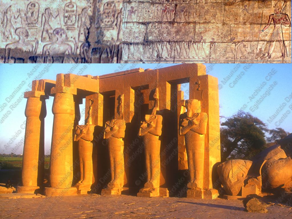 Immagine 6. Ramesseum: angolo nordest del secondo cortile e sfilata degli Antenati (19a dinastia, Ramses II); ogni dettaglio dei templi ha un suo significato creatore: dall’altezza delle colonne (16 cubiti, ossia 8 metri, l’altezza della piena ideale) al loro numero (nella sala ipostila ripete il numero dei mesi dell’anno e dei decani astronomici, ricreando e mantenendo così ciò cui si riferiscono. O, come nel caso della sfilata degli Antenati, si ricordano i faraoni del passato rafforzando il principio di regalità (© Archivio CRE/Maurizio Damiano).
