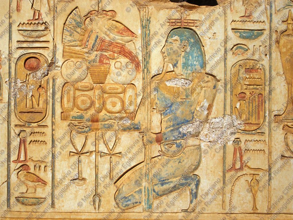 Immagine 7. Hapy reca i suoi doni. Hapy era non il Nilo deificato, bensì più precisamente l’incarnazione dello spirito della piena del Nilo. Dal tempio di Ramses II ad Abydos, 1a sala ipostila, parete Nord. Scene come questa, accompagnate dai geroglifici quasi onnipresenti, assicurano fecondità e prosperità al Paese (© Archivio CRE/Maurizio Damiano).