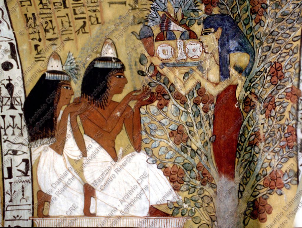 Immagine 8. Nella foto vediamo una scena sul soffitto della camera funeraria della tomba di Sennedjem (TT1, a Deir el Medina): vi si vedono Sennedjem e la moglie, Iyneferti, che ricevono pagnotte, bevande e altre offerte dalla “Dea del Sicomoro”, ossia Nut che sorge dall’albero. Come in tutti gli altri casi, anche qui si tratta di una vera realtà nella dimensione divina: i defunti vedranno perpetuata l’offerta e la protezione divina per l’eternità (© Archivio CRE/Maurizio Damiano).