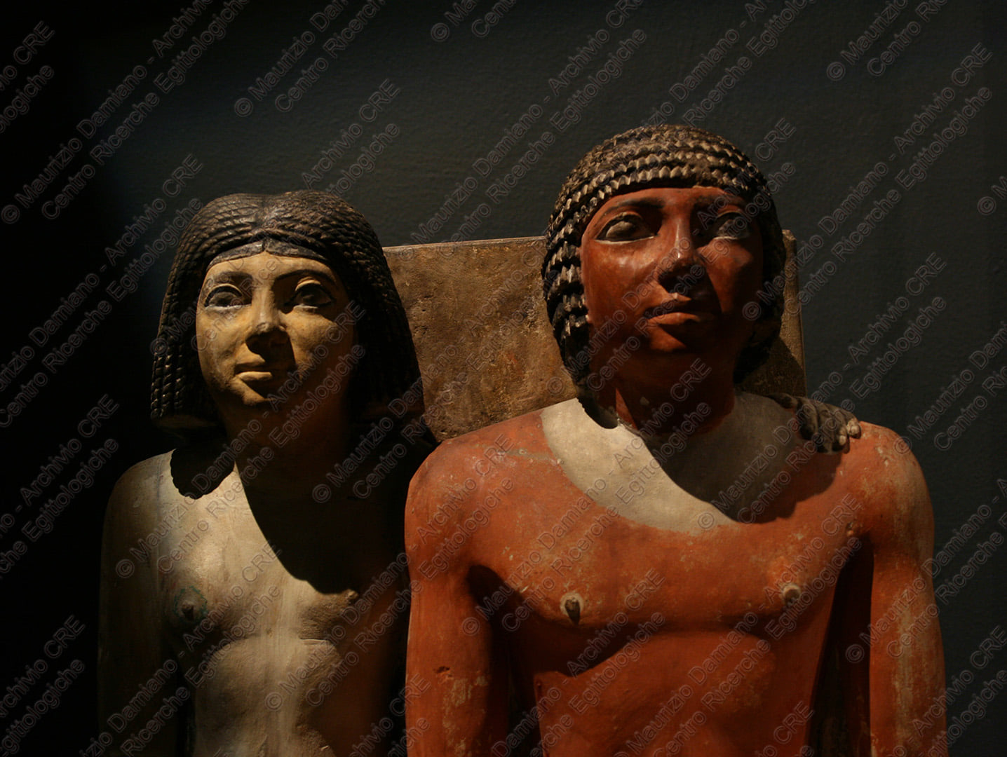 Immagine 2. Gruppo statuario dell’Antico Regno (Museo Archeologico di Alessandria); il significato delle statue era totalmente diverso da quello che noi diamo nel nostro concetto di arte; le statue erano una derivazione del potere magico della parole, una parola concretizzata in 3 dimensioni; i defunti, una volta svolta la cerimonia dell’apertura della bocca sulle statue, potevano passare fra le dimensioni (quella nostra, dei viventi, e quella di defunti e dèi) grazie alla magia religiosa della loro immagine, parola concretizzata in forma (© Archivio CRE/Maurizio Damiano).