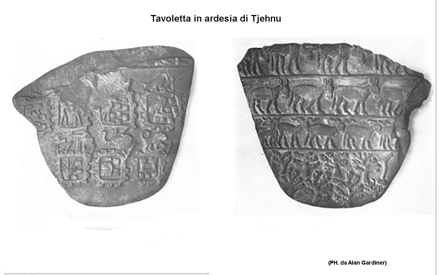 Fra questi splendidi esemplari, non certo il più bello ma uno dei più significativi è la Tavoletta in ardesia di Tjehnu. Su un lato riporta sette rettangoli con contrafforti che rappresenterebbero altrettante città conquistate, i geroglifici, ancora abbozzati, indicherebbero il nome delle città. Sull’altro lato sono rappresentati buoi, asini e arieti disposti su tre registri mentre nell’ultimo registro compaiono alberi, presumibilmente ulivi con un monogramma che l’egittologo tedesco Kurt Heinrich Sethe interpreta come Tjehnu, paese dei libici Tjehnyu, sicuramente la rappresentazione di un bottino di guerra.