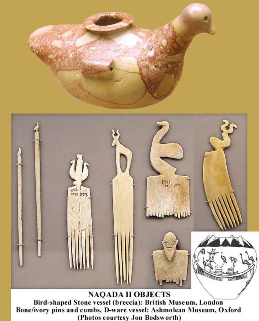 I vasi si presentano estremamente sottili con una decorazione a linee ondulate in rilievo, cucchiai e pettini d’avorio di una raffinatezza del tutto insolita per il periodo. Il ritrovamento di rame (alcuni grani ed un punteruolo) fanno pensare ad un periodo già successivo al neolitico, il “Calcolitico” (o eneolitico), periodo cioè dove rame e selce furono impiegati contemporaneamente. Non mi dilungherei troppo per non rischiare di tediare il lettore, vorrei solo precisare che sono stati individuati dagli studiosi tre periodi cronologici che si sono susseguiti nel tempo, il Badariano, l’Amratiano e il Gerzeano, periodi che, oltre a riferirsi a tempi diversi sono caratteristici spesso anche di differenti aree di diffusione.