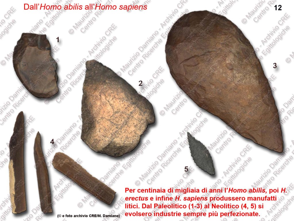Le foto ci mostrano i primi manufatti preistorici, i primi rozzi utensili risalenti al Paleolitico Basale dell’Homo abilis per poi evolversi con l’avvento dell’Homo erectus e dell’Homo Sapiens. Possiamo vedere manufatti in forme amigdaloidi simili a mandorle non ancora perfezionati.
