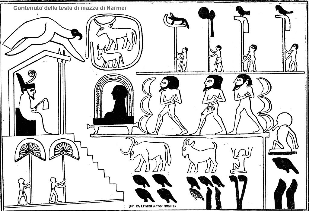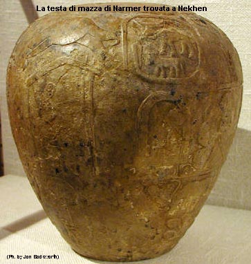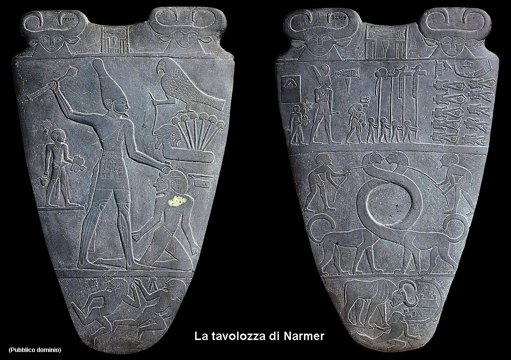 Come già accennato, il primo sovrano della I dinastia fu Narmer (o Menes), colui che unificò le Due Terre. L’evento viene messo in risalto dalle incisioni su una tavolozza per belletti, in grovacca a forma di scudo, rinvenuta da E. Quibell e F. W. Green, nel “Deposito principale” durante gli scavi a Ieracompoli nel 1897-1898. Si trovava con le teste di mazza del re Scorpione e di Narmer, durante gli scavi venne anche rinvenuta una testa di Horus sotto forma di falco, interamente rivestita d’oro. Più tardi però si scoprì che la testa risaliva alla VI dinastia.