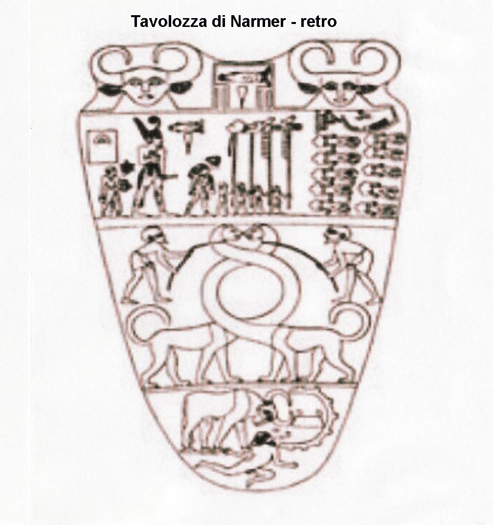 Il lato anteriore della tavolozza è diviso in tre registri: nel primo compare due volte una testa di vacca con le corna ripiegate, la Dea Hathor, mentre in posizione centrale spicca il serekht del sovrano, il secondo registro è dominato dalla grandiosa figura del re Narmer che indossa la corona bianca dell’Alto Egitto con, legata alla cintura, una coda di toro simbolo del potere, “Horus Toro Possente”. Il re è intento a colpire con una mazza il nemico che tiene per i capelli, come si conviene è seguito dal suo dignitario “Colui che porta i sandali”. Di fronte al re una scena che anticipa quella che sarà poi la stupenda Scrittura Geroglifica, ossia la volontà di esprimere qualcosa di più di quanto non sia possibile esprimere con il disegno. La scena, come riportato nella foto, potrebbe significare: “Il grande Horus-Narmer, “Toro Possente”, colui che ha soggiogato il popolo della terra dove cresce il papiro” (il Basso Egitto). Nel registro inferiore una scena di nemici uccisi.