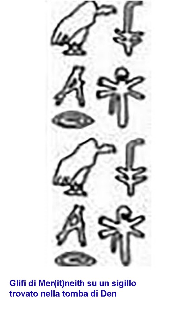 Djet prese come moglie principale la sorellastra Mer(it)neith, madre (forse) del successore di Djet, il figlio Den del quale avrebbe rivestito il rango di reggente. Nella tomba del sovrano Den è stata rinvenuta l’impronta di un sigillo a rullo dove compaiono i glifi del suo nome Mer(it)neith preceduto da quello della dea avvoltoio Nekhbet che aveva il ruolo di protettrice del sovrano dell’Alto Egitto.