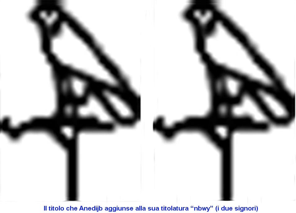 Alla sua già lunga titolatura, Anedijb si attribuì un’ulteriore titolo, quello di “Nebwy” (le due signore), ed è rappresentato da due falchi che simboleggiano i due patroni del suo stato divino, Horus e Seth e starebbero ad indicare l’Alto e il Basso Egitto legittimando ancor più, se ce n’era bisogno, il suo ruolo di re unico, sarà comunque l’unico a portarlo perché in futuro più nessun faraone lo utilizzerà.