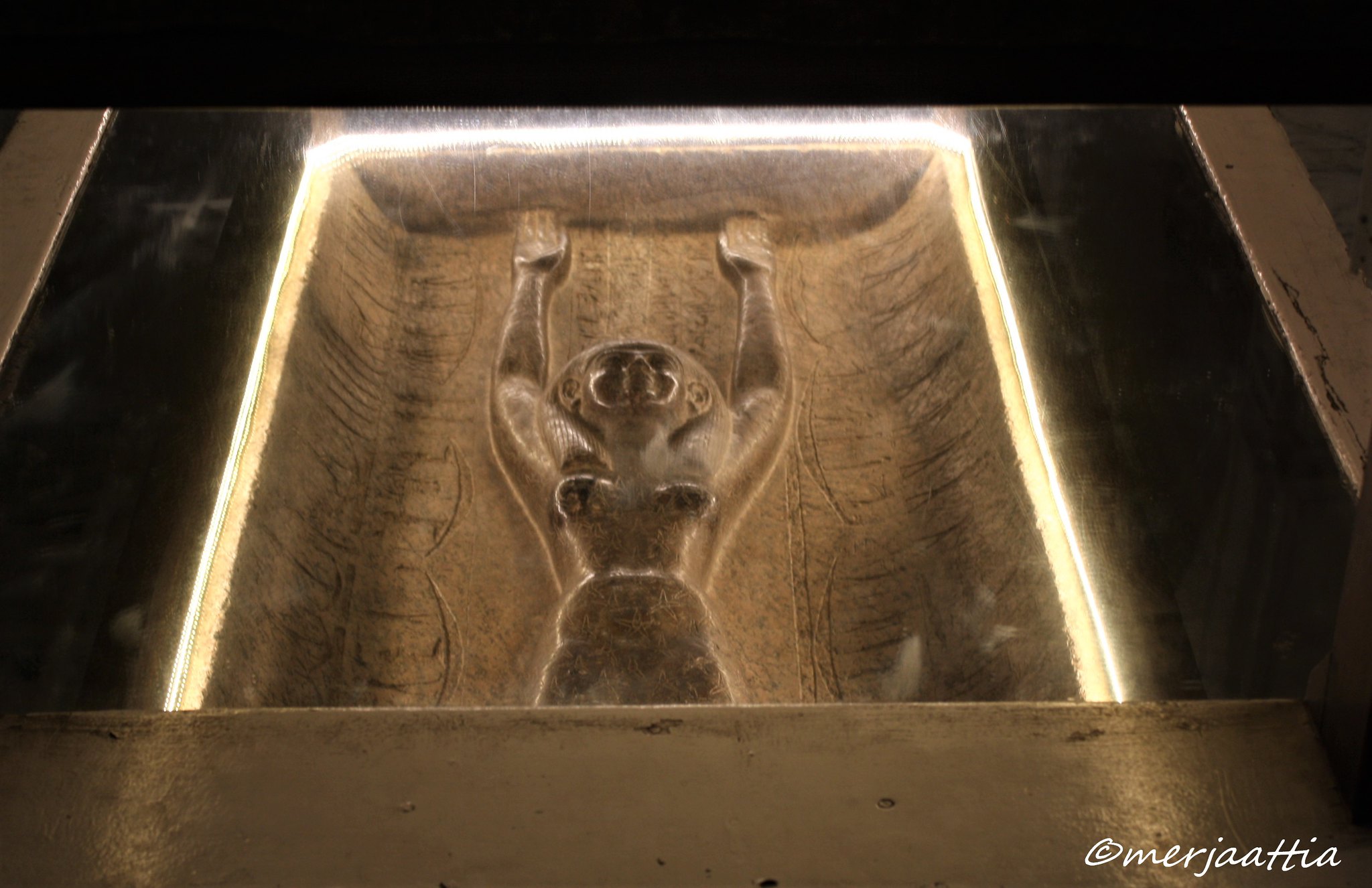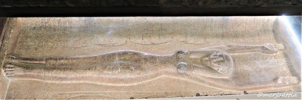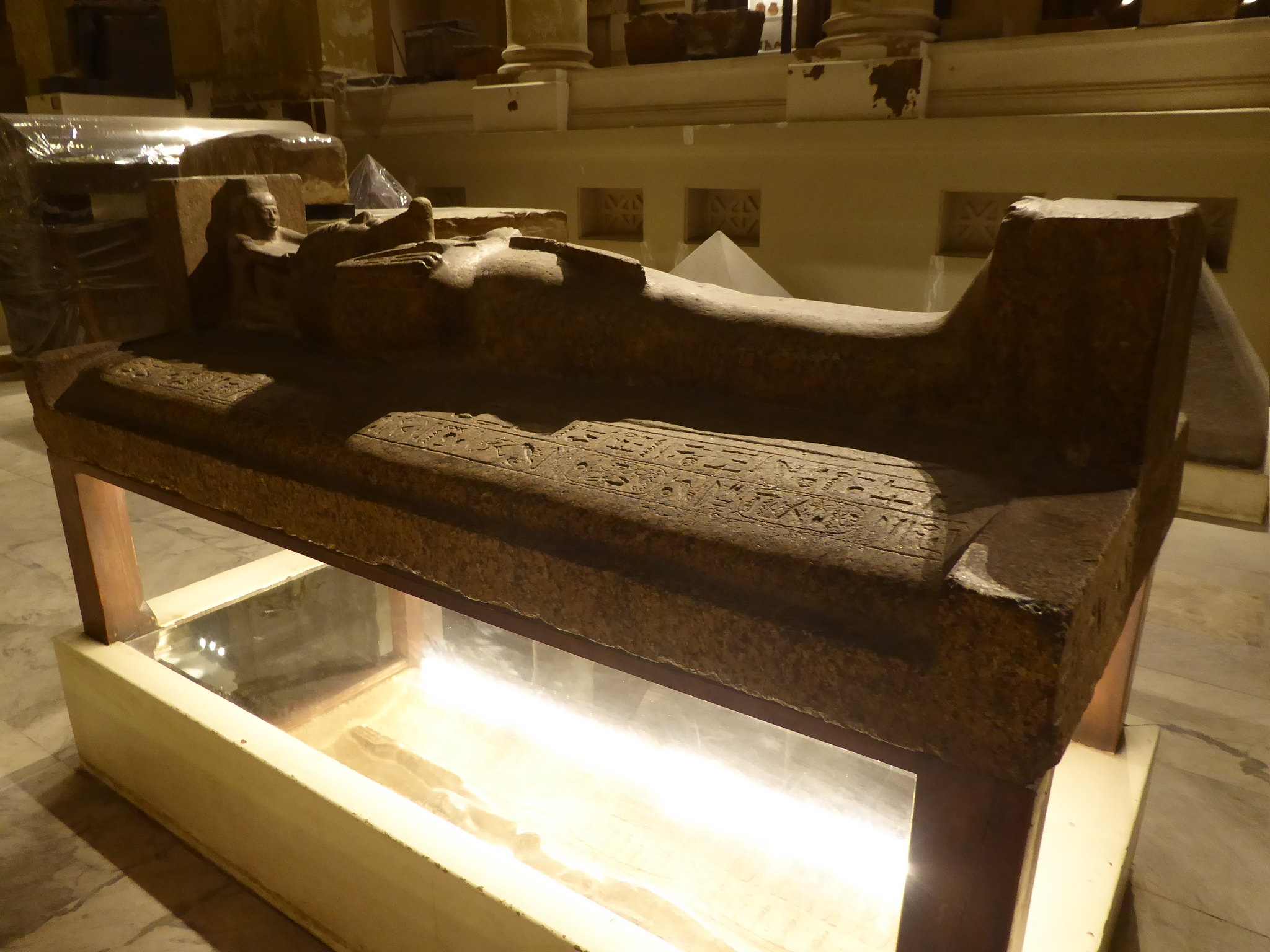 Lungo 2,40 m per 1,20 di larghezza ed alto 1,55 m con il coperchio, il sarcofago è uno splendido esempio di scultura della XIX Dinastia. Fu infatti preparato per Merenptah, il successore di Ramses II, due secoli prima di Psusennes, ed era in origine il terzo sarcofago di Merenptah (dei quattro preparati per il figlio di Ramses). Il sarcofago esterno di Merenptah è infatti ancora nella Valle dei Re e misura ben 4 m di lunghezza. Come abbiano fatto ad estrarre e trascinare fuori dalla tomba KV8 di Merenptah, che ha una lunghezza di circa 160 metri, questo sarcofago non riesco ad immaginarlo…