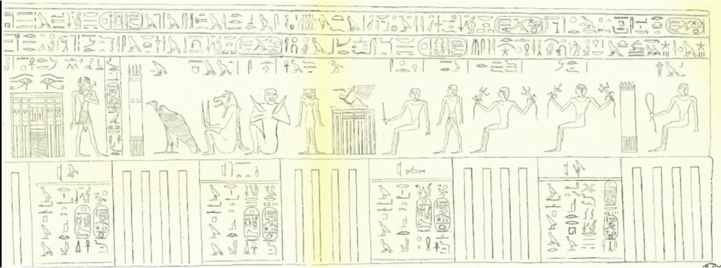 Sull’esterno ritroviamo alcuni dei Guardiani che abbiamo incrociato raffigurati nella tomba di Nefertari o sui sacrari di Tutankhamon. All’interno una processione di divinità recita invocazioni a Ra affinché conceda vita al Ba del Faraone e si perpetui la sua rinascita.