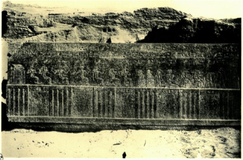 Una parte della processione degli dèi all’interno della vasca. Da destra: una divinità a testa di coccodrillo coinvolta nella cerimonia dell’apertura della bocca, Hounit, a testa di gatta, Anubi, Maat e Semd, già rappresentato nella tomba di Seti I