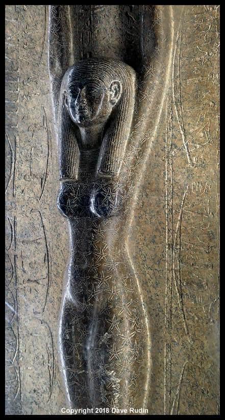 La parte più spettacolare del sarcofago è la parte interna del coperchio, con Nut che si protende sul corpo del Faraone con le braccia tese sopra di sé a proteggerlo. La dea indossa un abito aderente tempestato di stelle ed è di una bellezza stordente.