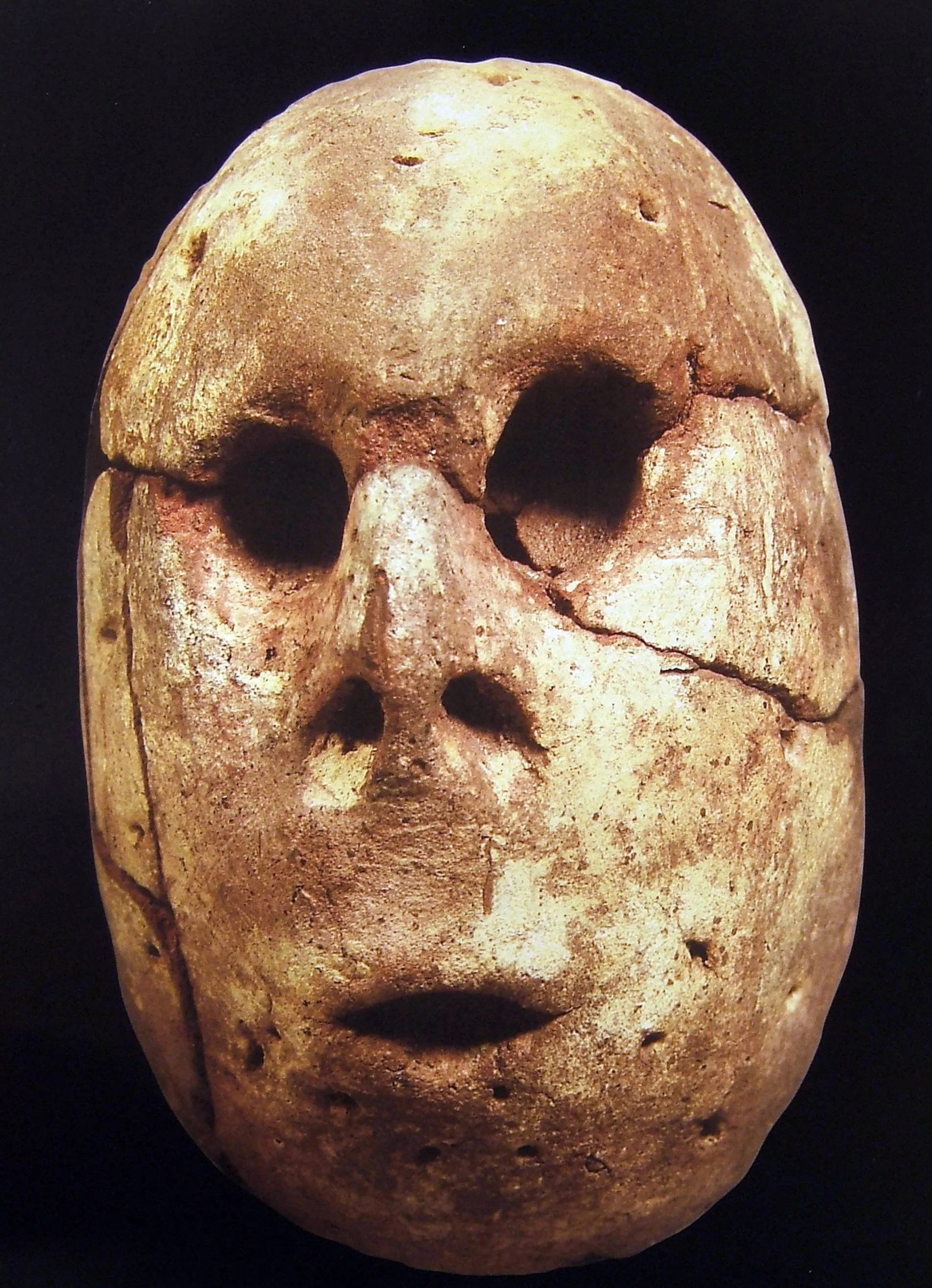 Testa maschile: è una delle più antiche rappresentazioni dell’uomo, capelli e barba venivano realizzati con veri peli umani, un bastone inserito nel foro inferiore ne faceva, forse, un feticcio magico-religiosa o un bastone di potere