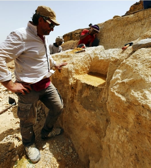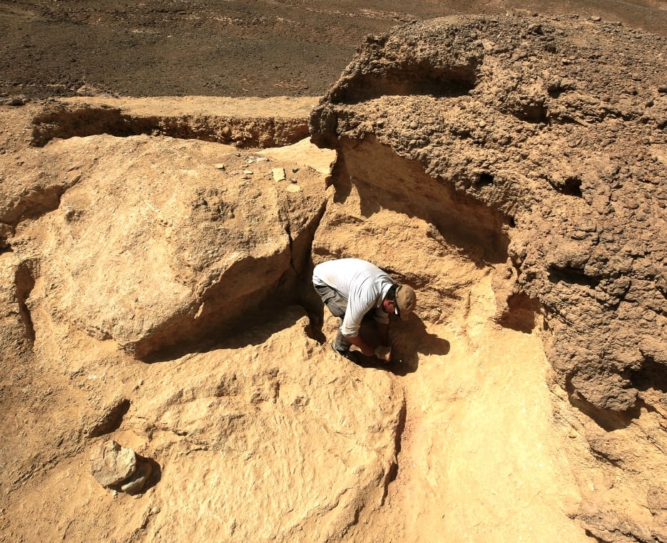 <<Questo sito è stato esplorato solo parzialmente durante una stagione, ma ci ha sorpreso non trovare molti dei tagli che normalmente caratterizzano le aree di lavorazione della pietra. In compenso, abbiamo trovato una grande quantità di substrato sabbioso. Più tardi, grazie alla sperimentazione, abbiamo compreso che si trattava dei residui dell’estrazione. L’osservazione delle tracce lasciate sulla pietra a Wadi el-Jarf e gli strumenti rinvenuti in situ ci permettono di ricostruire la “cassetta degli attrezzi” del cavatore che era, tutto sommato, piuttosto rudimentale>>.