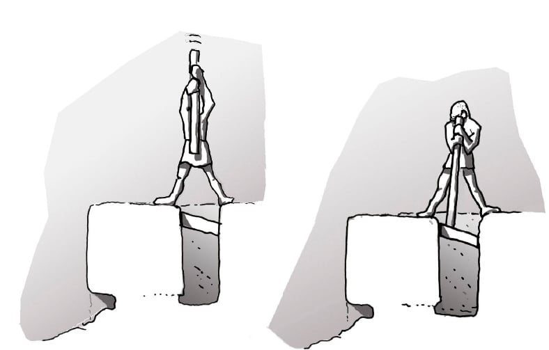 (Ai nostri giorni questo spazio si riduce a qualche millimetro, la larghezza necessaria al passaggio di dischi da taglio o fili elicoidali). Durante l’Antico Regno, la necessità di operare all’interno di una trincea di scavo implicava che questa avesse una larghezza di almeno una cinquantina di centimetri, il minimo indispensabile affinché un operaio potesse contare su un sufficiente spazio di manovra. Per questo motivo e per ridurre gli sprechi, bisognava inevitabilmente procedere all’estrazione di blocchi molto voluminosi. Si intuisce facilmente, infatti, che cavare blocchi piccoli e maneggevoli avrebbe comportato un enorme perdita di materiale da costruzione *. L’ottimizzazione era, inoltre, fortemente legata al problema del trasporto, la cui difficoltà aumentava proporzionalmente al peso del carico.