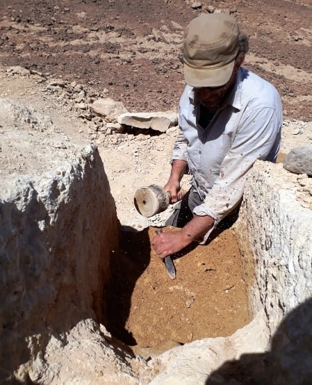 Franck Burgos ebbe, allora l’idea di bagnare la pietra. Si era accorto che la roccia del sito era particolarmente ricca di sale. In effetti, all’ingresso di alcune delle antiche gallerie si possono osservare numerose infiorescenze saline. Era evidente che, per un processo di litificazione, la pietra era diventata molto più compatta. Per di più la scarsa presenza di piogge aveva contribuito a mantenere molto alta la concentrazione di sale nella roccia. Si è pensato allora di scavare una depressione a fondo orizzontale di circa 50×50 cm. e di versarvi circa due litri d’acqua. Inaspettatamente essa è stata assorbita in meno di tre minuti e la pietra ha cambiato repentinamente d’aspetto e consistenza (Immagine n. 3) assumendo una colorazione più scura e diventando più tenera per una profondità di quasi 7 cm.
