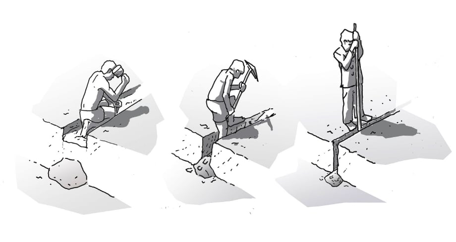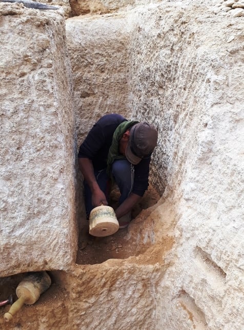 Il cavatore attaccava la roccia per mezzo di uno scalpello di rame, un mazzuolo in legno e, molto probabilmente con utensili litici. Si effettuava lo scavo di una trincea dall’alto in basso tenendo l’attrezzo perpendicolare ai letti sedimentari della roccia. L’utensile era tenuto a livello dei suoi piedi per cui lavorava solitamente in posizione accovacciata e le trincee verticali dovevano essere sufficientemente larghe in modo da consentirgli di poter operare man mano che lo scavo procedeva verso il basso. Le disponibilità tecnologiche nell’Antico Regno, sembrano non comprendere attrezzi metallici di grosse dimensioni. Lo scalpello era un piccolo e semplice strumento di rame lungo una ventina di centimetri, per cui il cavatore doveva lavorare nella trincea accompagnandolo con la mano. E’ interessante notare, in proposito, come l’ottimizzazione della produttività estrattiva, nel corso del tempo, sia legata all’evoluzione degli utensili e al miglioramento della loro resistenza: l’uso di strumenti più performanti come picconi, pali da cavatore o anche scalpelli molto lunghi ha consentito di ridurre la larghezza dei tagli di scavo sino a pochi centimetri (Immagine n. 3).