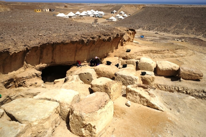 Immagine n. 4 Wadi el Jarf, blocco di chiusura davanti all’ingresso di una galleria. I cavatori hanno sfruttato in tutta evidenza lo strato marnoso (chiaramente visibile nella parte sinistra, di colore più intenso) per staccarlo agevolmente dal suo substrato roccioso. (©Franck Burgos & Emmanuel Laroze, JAEA 4, 2020 p.78)