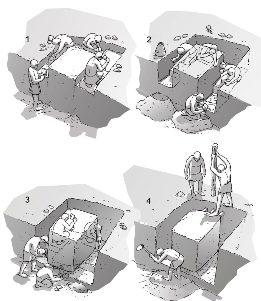 La schematizzazione in 4 fasi dell’estrazione di un blocco a Wadi el-Jarf, operata da una squadra di 4 persone: