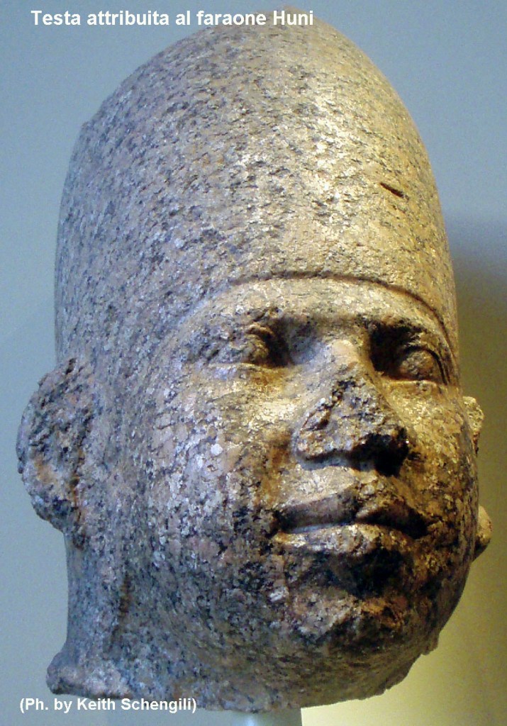Secondo le ipotesi più accreditate Huni avrebbe ordinato la costruzione della piramide di Maidum che nelle sue intenzioni doveva ricalcare quella del suo antenato Djoser, ovvero una piramide a gradoni sul tipo di quella di Saqqara, ma per una ragione che non conosciamo non riusci ad ultimarla. Si pensa che sia stato suo figlio Snefru a farla completare con l’intenzione di trasformarla in piramide vera e propria con le facce lisce.