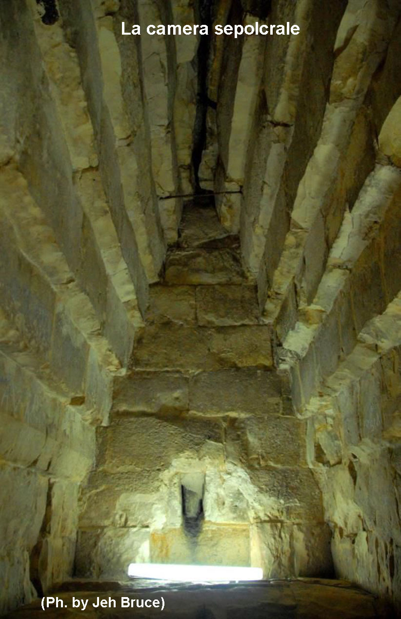 Nel soffitto, attraverso un’apertura che sale verticalmente per 6,65 m si accede alla camera funeraria le cui dimensioni sono di 5,90 m per 2,65 m, con un’altezza, (al culmine), di 5,05 m. La camera è scavata quasi per intero nella roccia di fondo, le pareti, per soli 50 cm, e l’intera volta, si trovano all’interno della struttura della piramide.