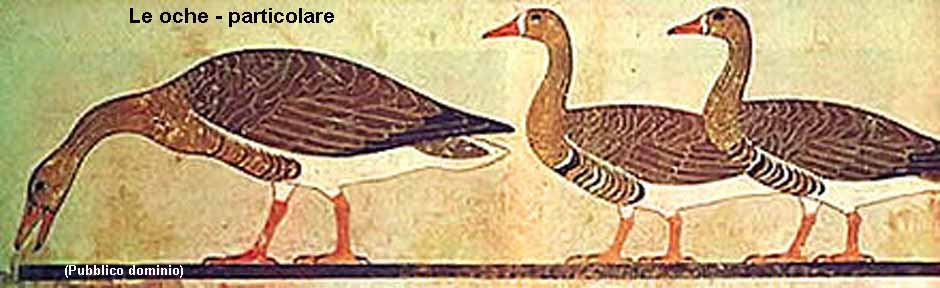 L’affresco riporta, con notevole tecnica pittorica in modo simmetrico sei oche, divise in due gruppi speculari, molto realistiche nella forma e nei colori. L’arte pittorica egizia ebbe nel periodo storico dell’Antico Regno, la massima attenzione per i dettagli di animali e piante, tanto che ancora oggi è possibile individuare la specie delle oche, dal piumaggio stilizzato.