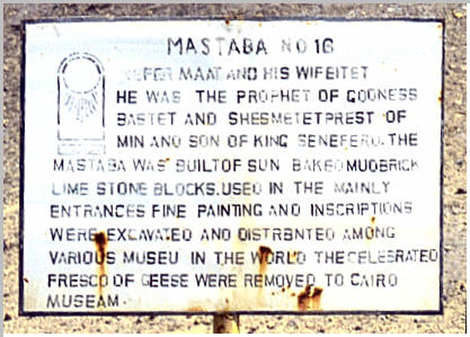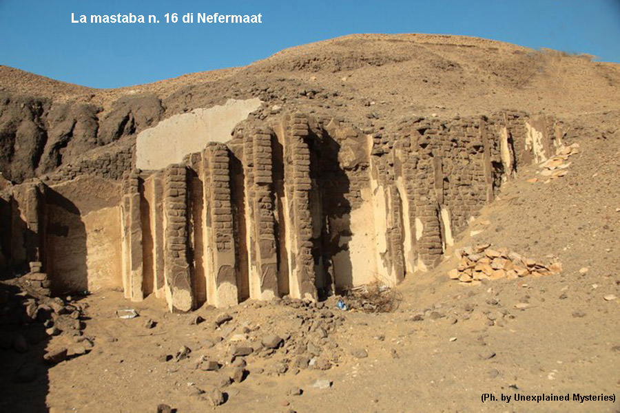 Qui Mariette, nel 1871, scoprì la mastaba n. 16, il cui proprietario era il principe Nefermaat, (Maat è splendida), e di sua moglie Atet. All’interno furono rinvenuti due bassorilievi raffiguranti scene di caccia e piccoli animali.