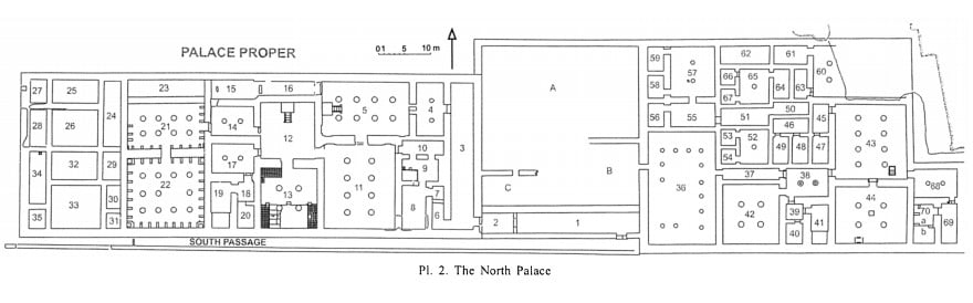 Le stanze N sono considerate bagni, e una vasca di pietra era ancora in situ in una di esse. La stanza centrale (K) aveva una coppia di colonne che fiancheggiavano una pedana rialzata che probabilmente ospitava un trono; dietro di essa si trovavano una camera da letto (L) ed un’anticamera riccamente decorate (P). La stanza M aveva una serie di colonne ed una mensola di legno sostenuta da pilastri di mattoni che correva lungo entrambe le pareti lunghe ad un’altezza di 80 cm dal pavimento; questa, ed almeno altre nove stanze simili trovate alla periferia della struttura potevano essere stati magazzini di stoccaggio.