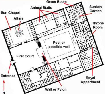 Il Palazzo era una residenza indipendente costruita lungo tre lati di un vasto recinto rettangolare che misurava 112 per 142 metri; al centro del lato corto ad ovest (a sinistra nelle immagini) si apriva una porta affacciata sul Nilo che dava ingresso al cosiddetto “primo cortile”, delimitato sul lato opposto da un muro nel quale si aprivano un ingresso monumentale al cortile principale, due ingressi più stretti e, forse, una finestra delle apparizioni.