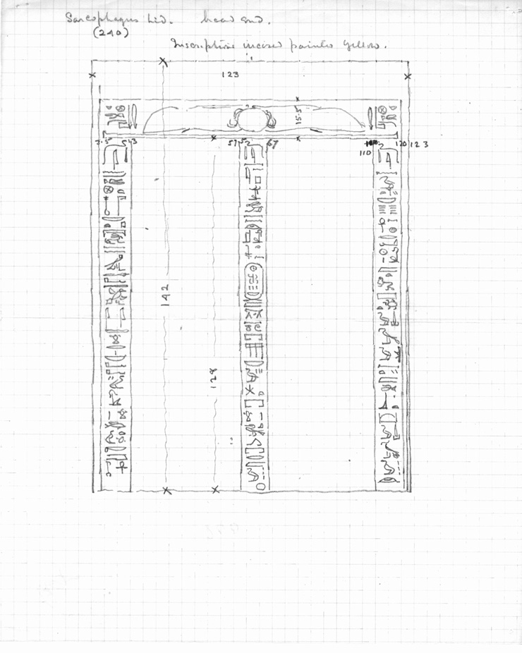 Le iscrizioni sul coperchio riportano invocazioni di Behedety (Horus il Vecchio, un caso unico nei sarcofagi della XVIII Dinastia), di Anubi e di Thot. Stranamente non è citata Nut, presente in molte altre iscrizioni della tomba.