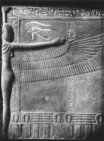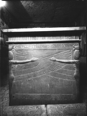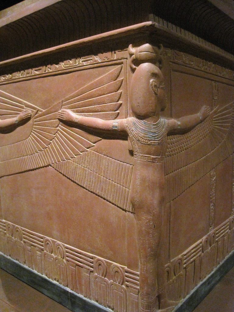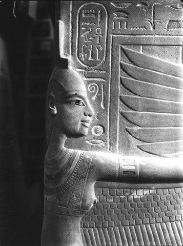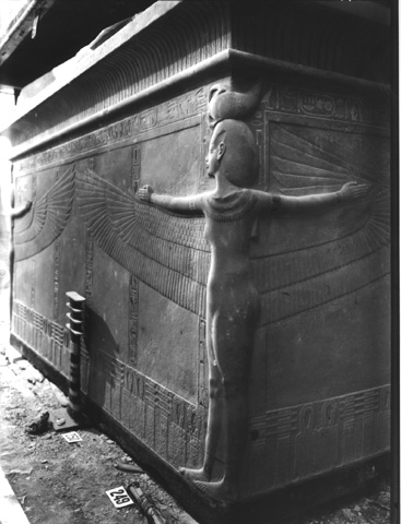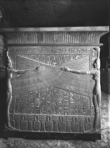 Iside (a sinistra) e Nephti (a destra) sul lato ovest, a protezione della testa del Faraone. Si noti l’intreccio strano di braccia ed ali, con le mani di ciascuna dea sovrapposte all’ala dell’altra a causa dell’aggiunta postuma di queste ultime.