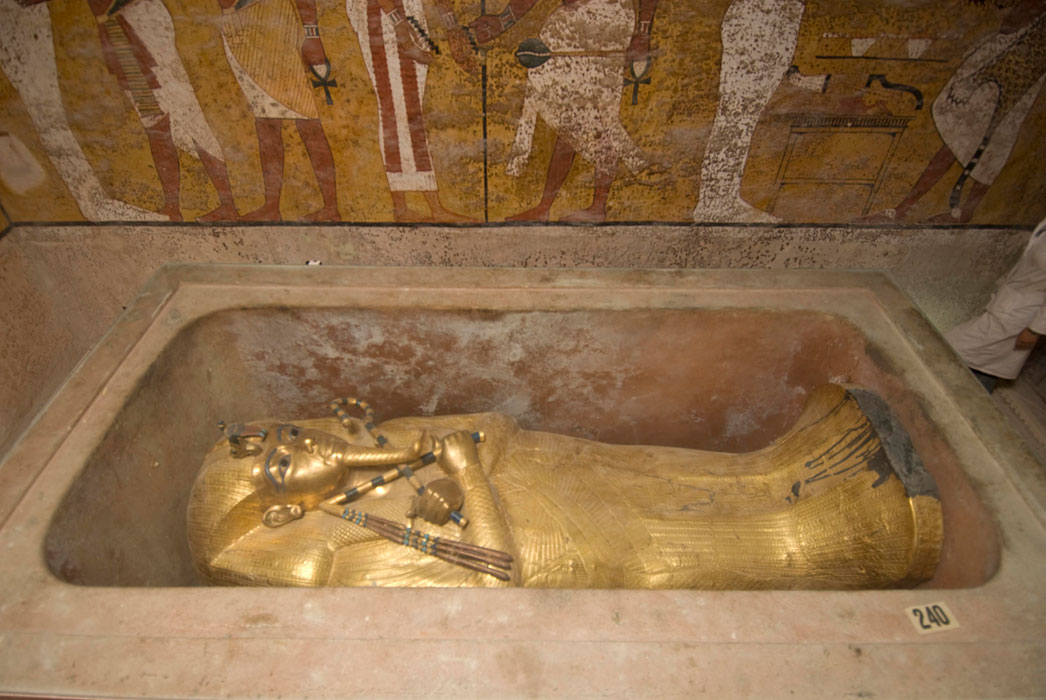 Il sarcofago con la lastra di vetro a protezione della prima bara e della mummia di Tutankhamon