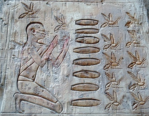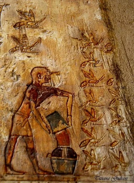 Raccolta e conservazione del miele, dalla “Tomba delle api”, TT279, tomba di Pabasa, El-Assasif (foto Tiziana Giuliani). “Il dio Ra pianse, le lacrime scese dai suoi occhi caddero a terra e si trasformarono in api. Le api fecero il loro alveare e si operarono con i fiori di ogni pianta per produrre miele e cera. Così anche il miele e la cera d’api fuoriuscirono dalle lacrime di Ra”. Papiro Salt 825