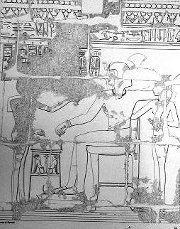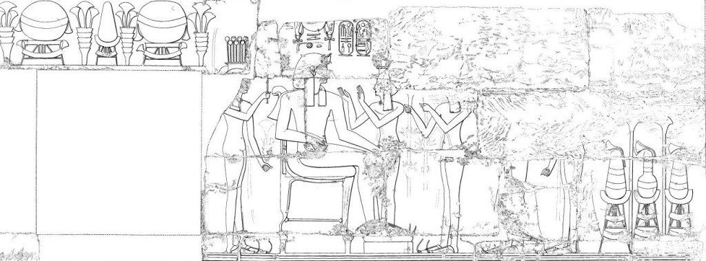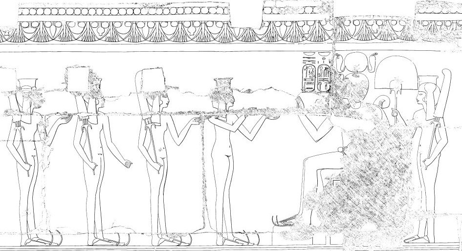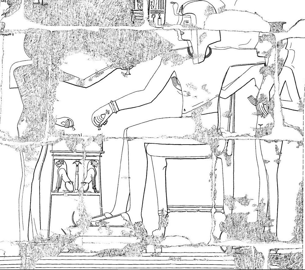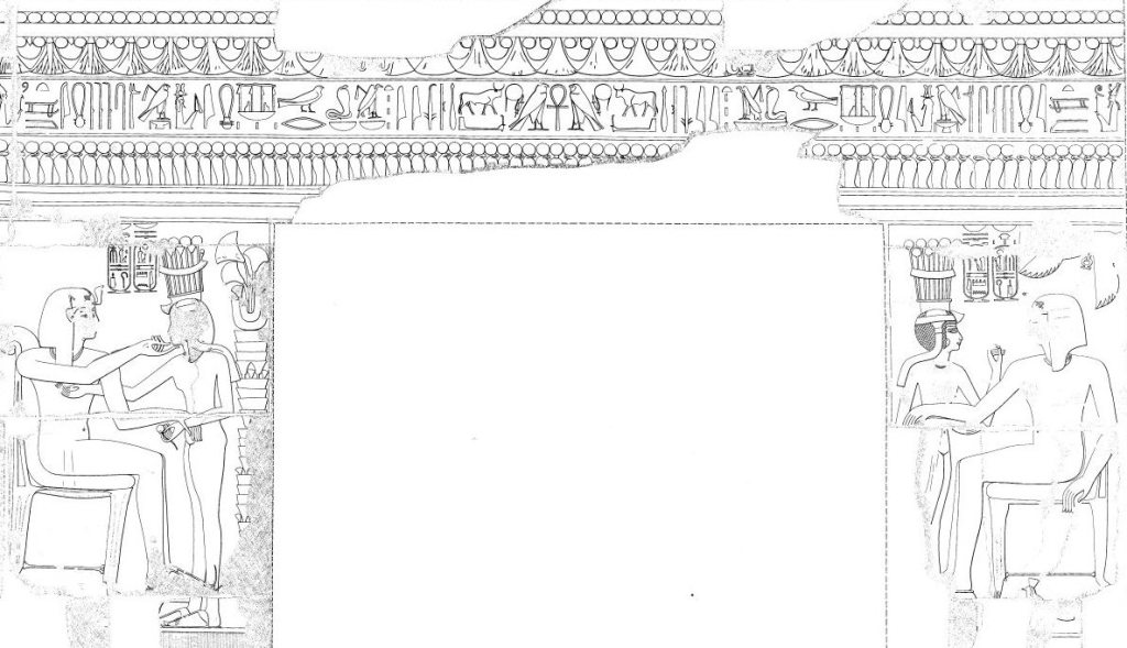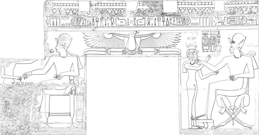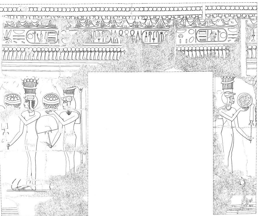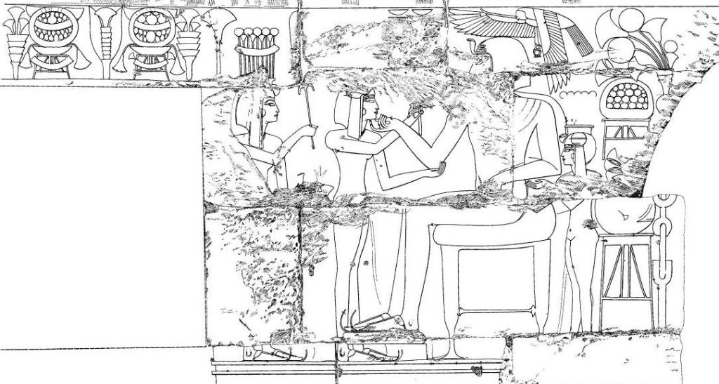 Le pareti erano decorate con rilievi che rappresentavano il re seduto sul trono mentre riceve fiori, frutta e gli omaggi di giovani fanciulle, mentre gioca a senet con una di esse abbracciandone un’altra; le ragazze indossano i sandali, una decorazione floreale sui capelli ed una collanina di perline al collo, ma per il resto sono completamente nude.