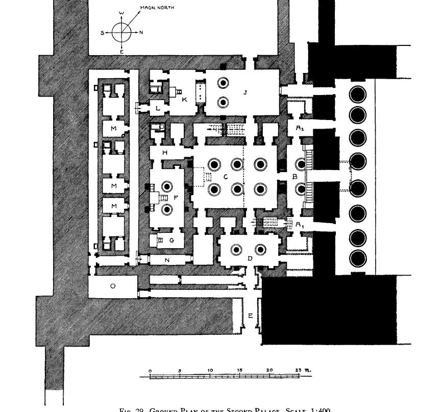 Sul fondo di questa stanza si apriva un vestibolo (H) che dava ingresso all’appartamento reale, costituito da un’anticamera con due colonne ed un podio per il trono (stanza F), da una camera dotata di un podio dove veniva collocato il letto (stanza G) e sulla destra del vestibolo da un bagno e da un’altra piccola stanza ad esso attigua.