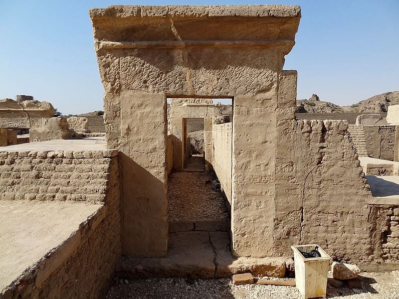 Il tempio funerario era collegato al Nilo per mezzo di un canale, perchè potesse essere raggiunto dalle barche delle processioni rituali nelle festività religiose; la banchina per lo sbarco era collegata da un corridoio in pietra all’ingresso principale della muraglia posto sul lato est, che costituiva l’unico accesso alla cittadella ed era difeso da due torrioni a pianta quadrata con facciata realizzata in blocchi di pietra che si ergevano al di sopra della cinta.