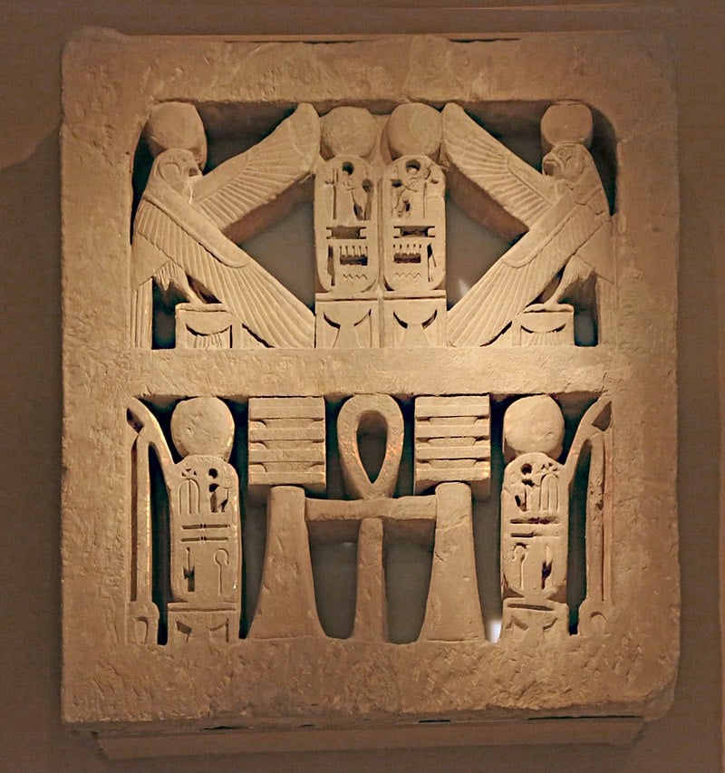 Originariamente era collocata in alto sulla parete e permetteva solo alla luce indiretta di entrare nella stanza. La decorazione è una celebrazione del sovrano, al quale vengono augurate vita e stabilità E’ divisa in due registri: la parte superiore è decorata con due cartigli che portano il nome di intronizzazione di Ramses III (wsr m3՚t r՚ mr imn ossia Usermaatra Meriamon = Potente è la Maat di Ra, amato da Amon), incorniciato da falchi solari; sul fondo compaiono i simboli geroglifici della vita (ankh) e della stabilità (djed), fiancheggiati a loro volta da cartigli con il nome di nascita del re (r՚ ms sw hq3 jwnw ossia Ramessu heka Iunu = Nato da Ra, signore di Iunu).